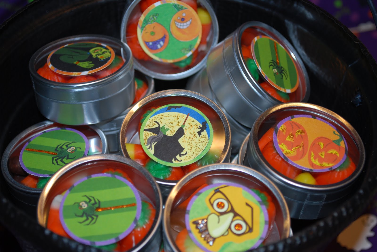 For Wild Child's class I used some wedding favor tins I got on clearance at Walmart a couple years ago. I am trying to use my "stash" before I buy anything else...my supply baskets are running over! I added a couple punched circles from Halloween paper I have had FOREVER! Then of course...I added a little glitter to each one...and filled them with pumpkins and candy corn. Wild Child signed a tag on the bottom of each one.